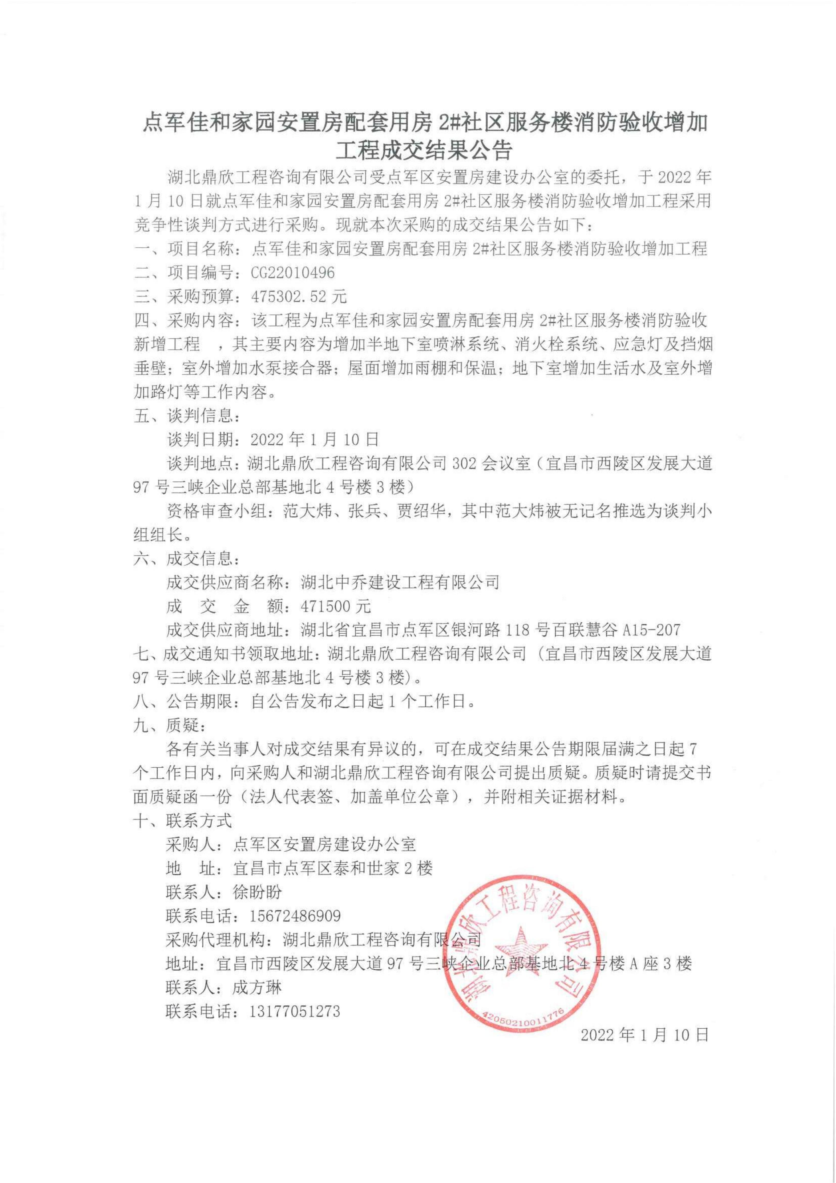 點軍佳和家園安置房配套用房2#社區(qū)服務(wù)樓消防驗收增加工程成交結(jié)果公告