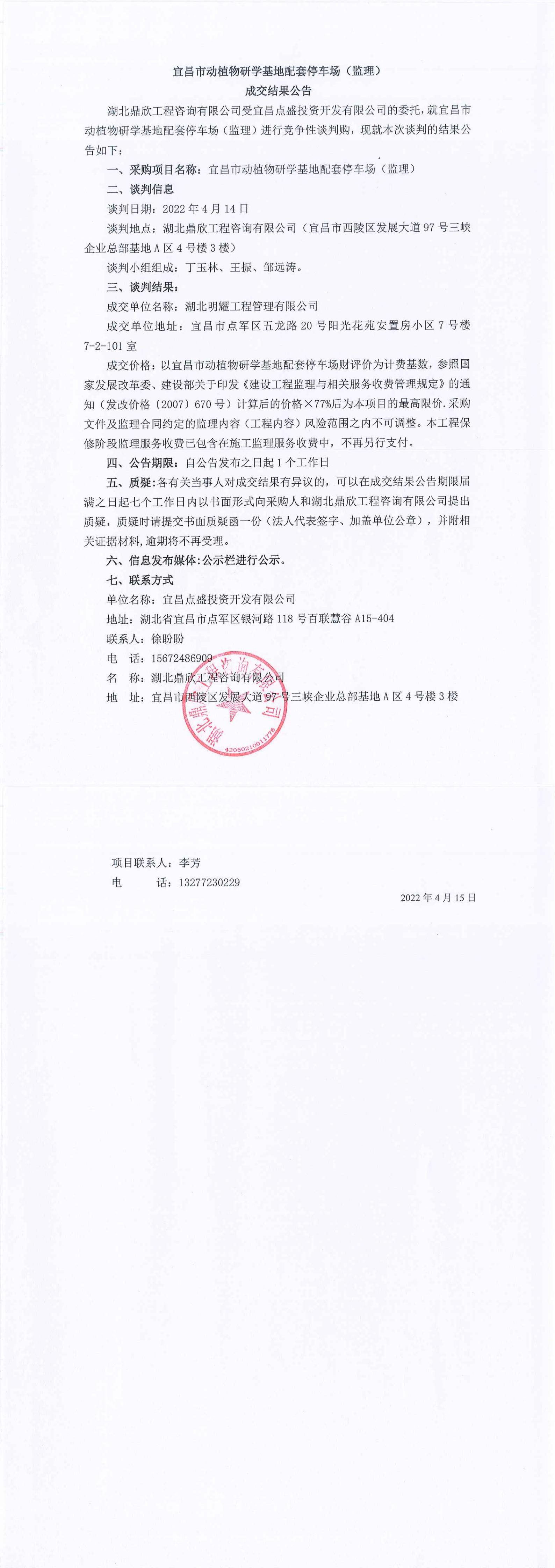 宜昌市動植物研學(xué)基地配套停車場監(jiān)理成交公告