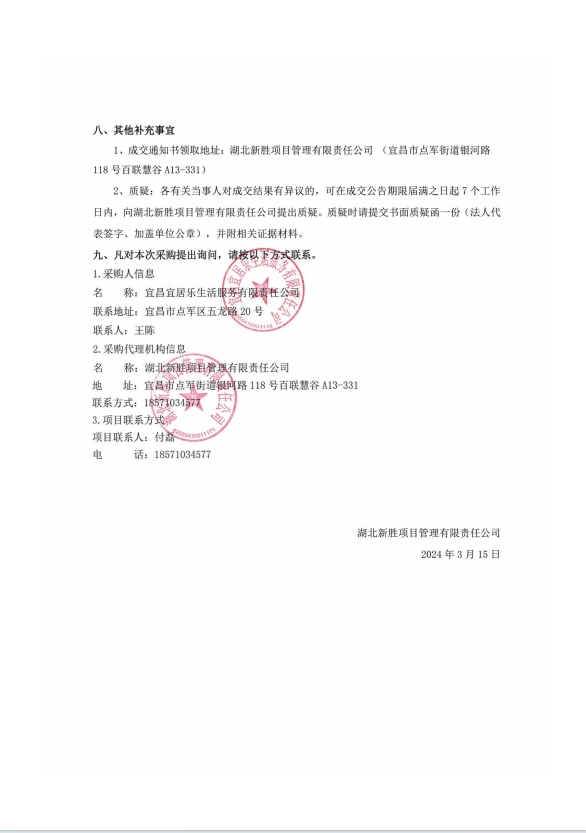 宜昌宜居樂生活服務(wù)有限責(zé)任公司商業(yè)物業(yè)保潔及秩序維護(hù)服務(wù)項(xiàng)目成交結(jié)果公告