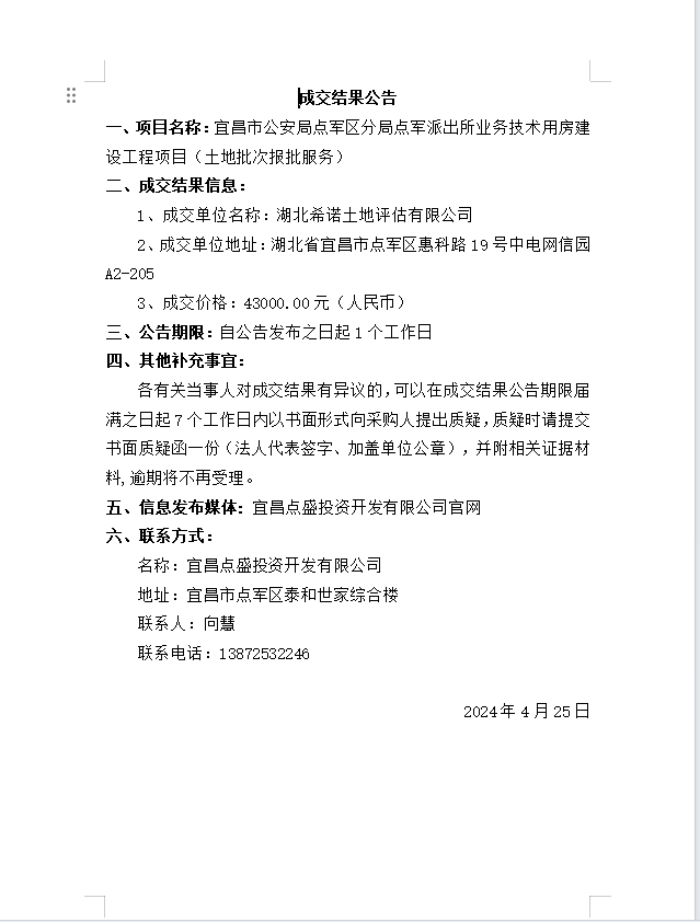 宜昌市公安局點(diǎn)軍區(qū)分局點(diǎn)軍派出所業(yè)務(wù)技術(shù)用房建設(shè)工程項(xiàng)目 (土地批次報(bào)批服務(wù))成交公告