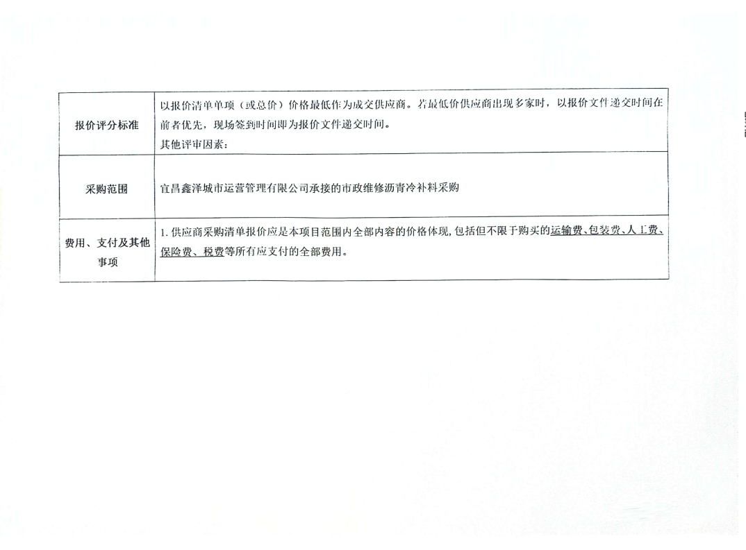 宜昌鑫澤城市運(yùn)營(yíng)管理有限公司瀝青冷補(bǔ)料采購(gòu)項(xiàng)目詢價(jià)公告