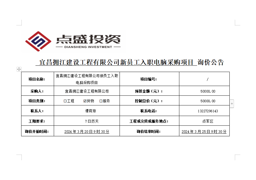 宜昌擁江建設(shè)工程有限公司新員工入職電腦采購項(xiàng)目詢價(jià)公告