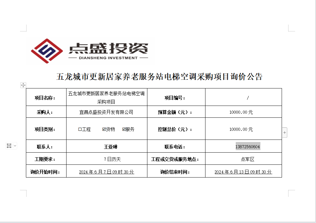 五龍城市更新居家養(yǎng)老服務(wù)站電梯空調(diào)采購項目詢價公告