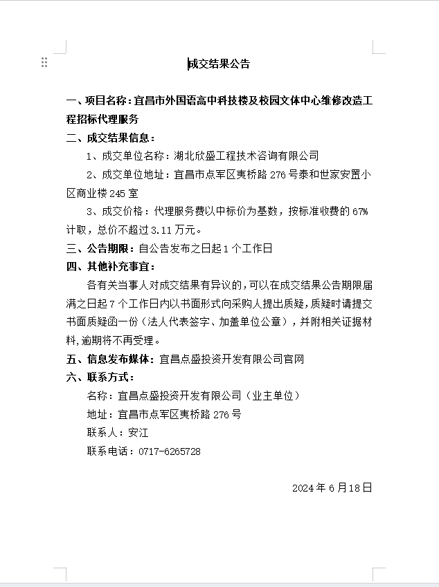 宜昌市外國(guó)語(yǔ)高中科技樓及校園文體中心維修改造工程招標(biāo)代理成交公告
