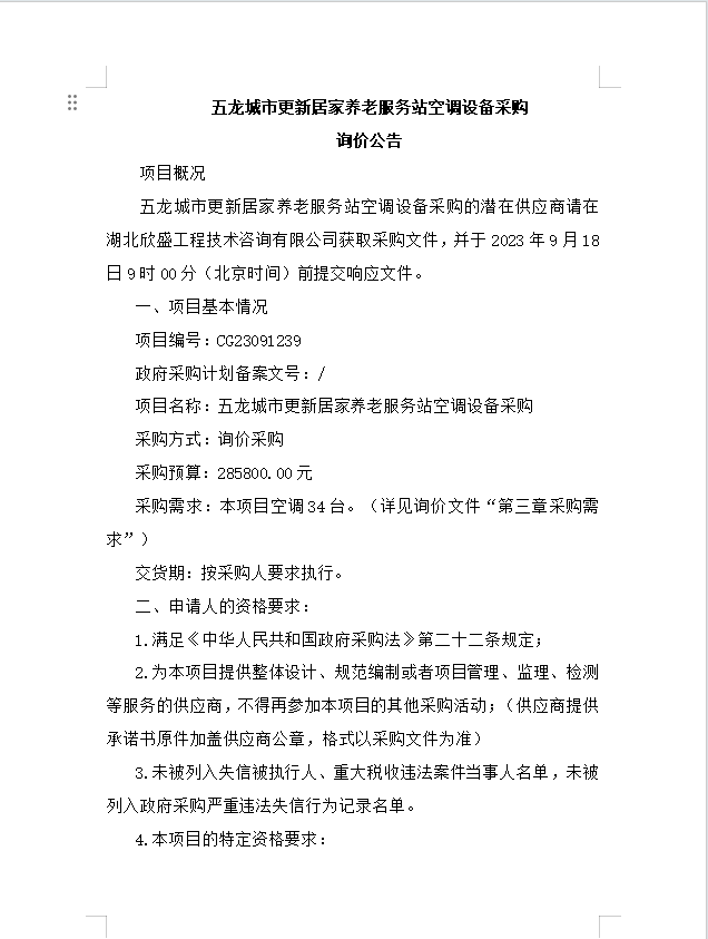 五龍城市更新居家養(yǎng)老服務(wù)站空調(diào)設(shè)備采購(gòu)詢價(jià)公告
