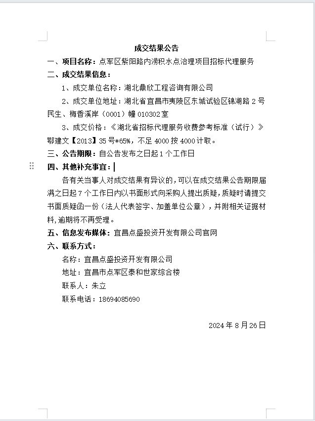 點(diǎn)軍區(qū)紫陽(yáng)路內(nèi)澇積水點(diǎn)治理項(xiàng)目招標(biāo)代理服務(wù)成交公告