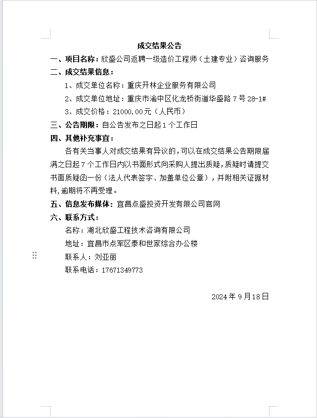 欣盛公司返聘一級造價工程師(土建專業(yè))咨詢服務(wù) 成交公告