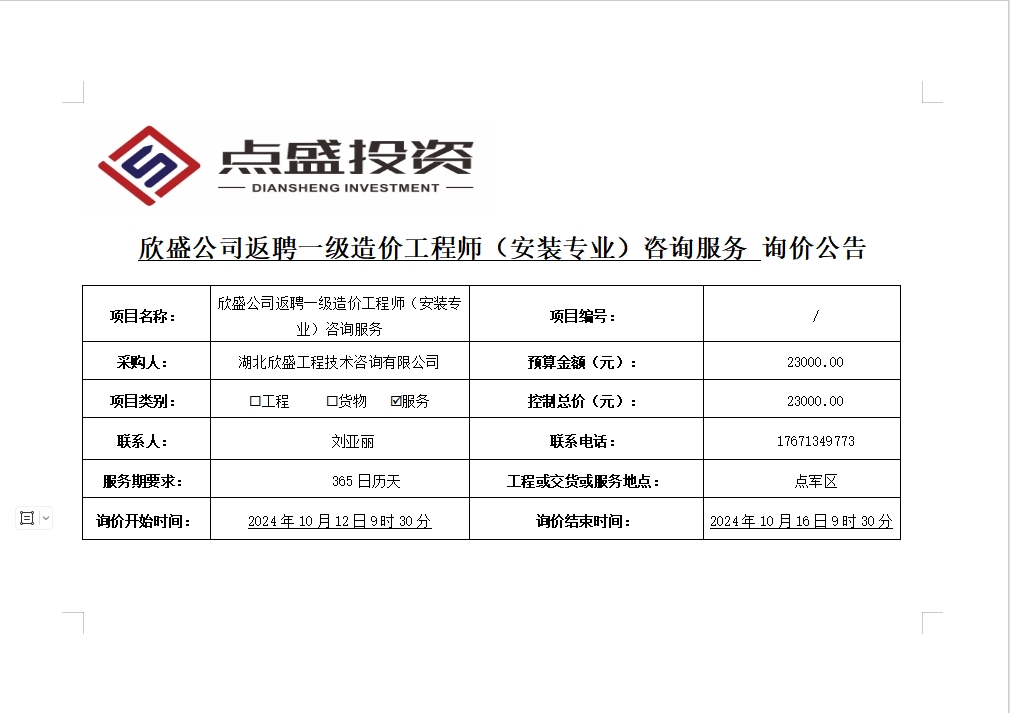 欣盛公司返聘一級(jí)造價(jià)工程師(安裝專業(yè))咨詢服務(wù)詢價(jià)公告