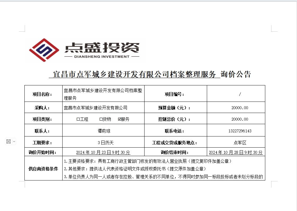 宜昌市點(diǎn)軍城鄉(xiāng)建設(shè)開(kāi)發(fā)有限公司檔案整理服務(wù)詢(xún)價(jià)公告