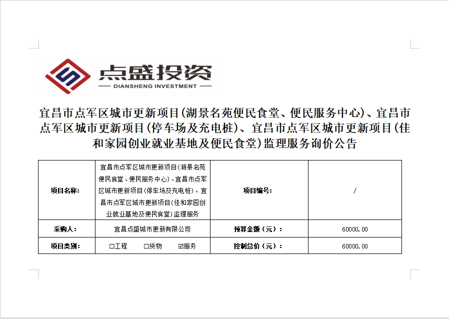 宜昌市點(diǎn)軍區(qū)城市更新項目(湖景名苑便民食堂、便民服務(wù)中心)、宜昌市點(diǎn)軍區(qū)城市更新項目(停車場及充電樁)、宜昌市點(diǎn)軍區(qū)城市更新項目(佳和家園創(chuàng)業(yè)就業(yè)基地及便民食堂)監(jiān)理服務(wù)詢價公告