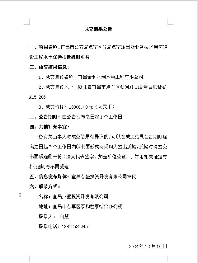 宜昌市公安局點(diǎn)軍區(qū)分局點(diǎn)軍派出所業(yè)務(wù)技術(shù)用房建設(shè)工程水土保持報(bào)告編制服務(wù)成交公告