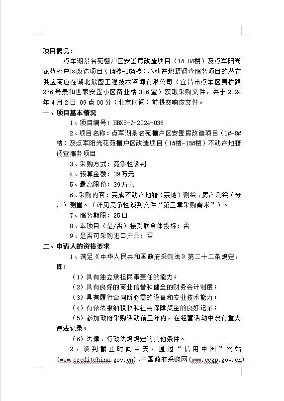 點(diǎn)軍湖景名苑棚戶區(qū)安置房改造項(xiàng)目(1#-8#樓)及點(diǎn)軍陽光花苑棚戶區(qū)改造項(xiàng)目(1#樓-15#樓)不動(dòng)產(chǎn)地籍調(diào)查服務(wù)項(xiàng)目談判公告