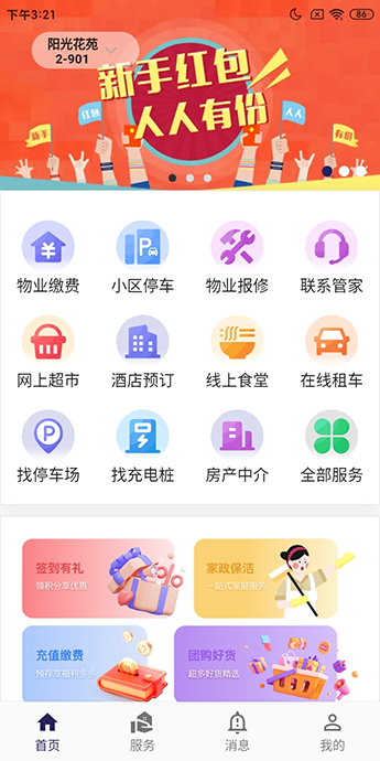 包括物業(yè)繳費(fèi)、小區(qū)停車、物業(yè)報(bào)修、意見(jiàn)反饋、樓棟管家、賬單查詢、訪客邀請(qǐng)、家政清潔、養(yǎng)老護(hù)理、寵物代養(yǎng)等功能。